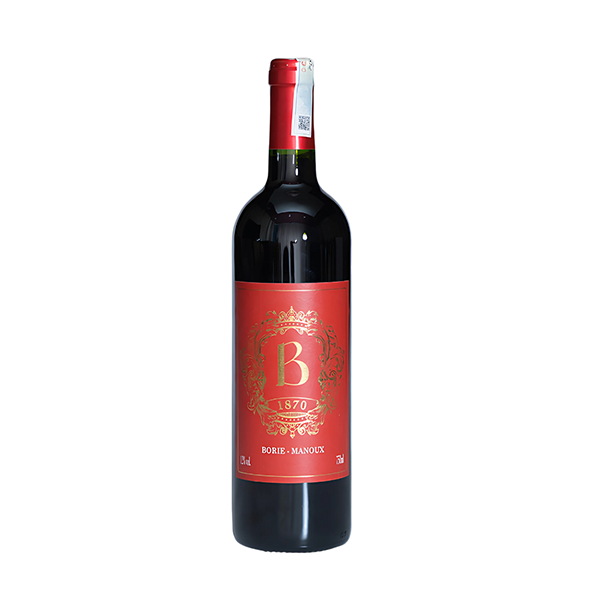 Vang Pháp B 1870 Borie Manoux là dòng vang đỏ Bordeaux bình dân, mang đậm phong cách truyền thống Pháp, được sản xuất bởi nhà Borie-Manoux uy tín. Rượu có màu hồng ngọc, hương thơm trái cây chín đỏ (anh đào, nho đen), hương vị thanh lịch, mượt mà và nồng độ nhẹ nhàng (12%~13%), rất thích hợp để thưởng thức hàng ngày